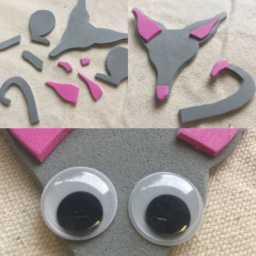 • Step 2 Download the template here and use it to cut out your bilby pieces from self-adhesive foam. Peel the backing from the small pink accent pieces and press firmly in place on the ears, nose and tail as shown. Use glue to attach wiggle eyes onto the face. Allow to dry.