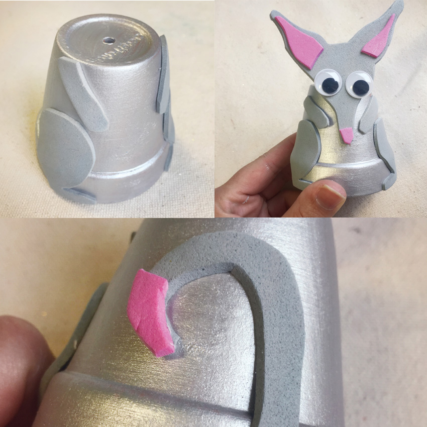 • Step 3 Use PVA glue and foam pieces and press them firmly in place on the pot. Start with the legs and arms, the tail and finally the head. You will only need to remove half of the backing paper from the head so the part sticking above the pot remains covered.