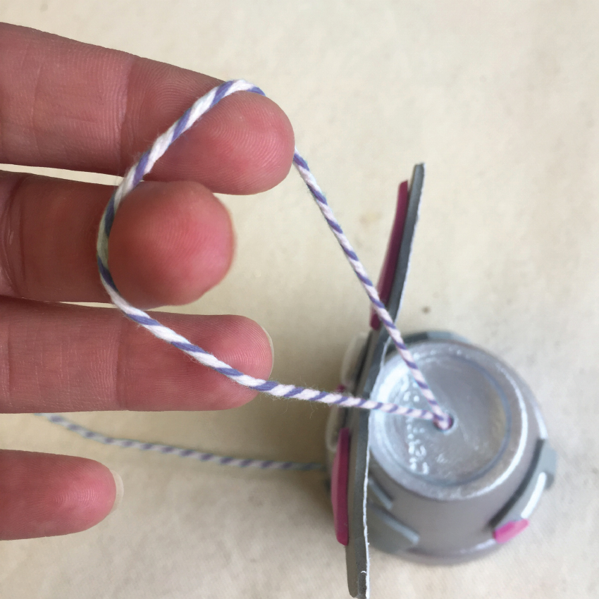 • Step 5 Cut a length of baker's twine approximately 60cm long. Tie a loop at one end and thread this loop up through the inside of the pot to the outside. The knot will hold the pot in place when you hang the bell from the loop.