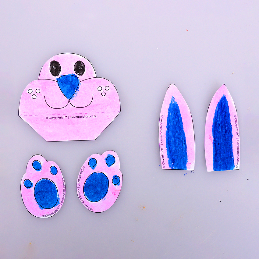• Step 2Print and decorate the template provided. Allow to dry if needed then cut out your bunny template pieces. Adult supervision is recommended when using scissors.