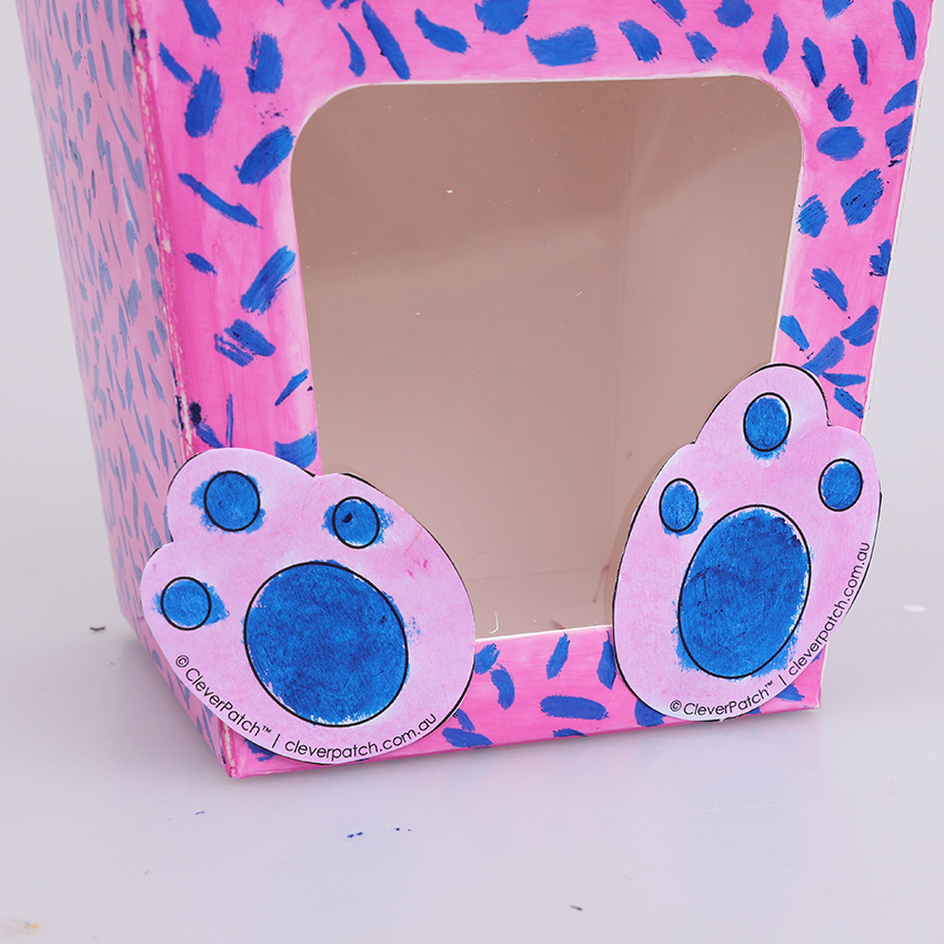 • Step 6Use glue dots to stick the feet in place at the bottom of the box on either side of the window as shown. You can also add a little cotton ball tail on the back of your box!