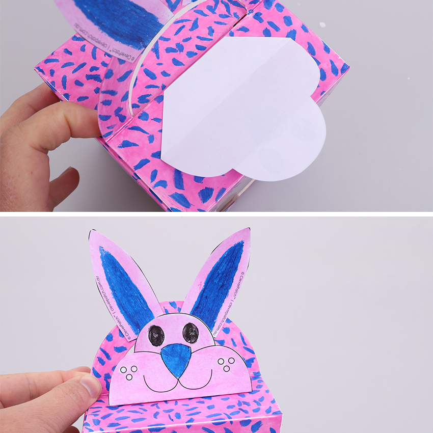 • Step 5Mountain fold along the dotted grey line of the bunny face template piece. Use glue dots to stick the tab (decorated side down) onto the top of the box. Align the tab edge with the middle line where the box lid tabs meet. Bend the bunny face back so it is positioned in front of the bunny ears.