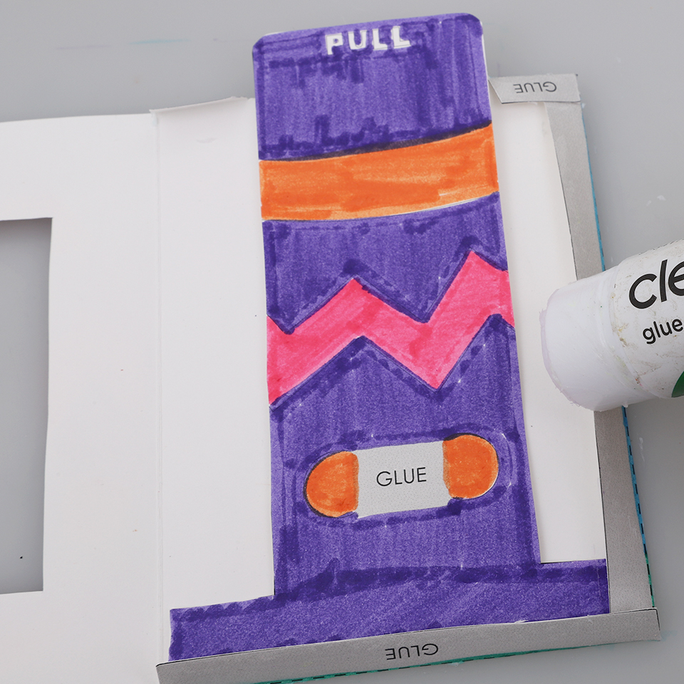 • Step 4Turn the card over so the design is face down. Place the slider into the right-hand side of the card, so that the ‘Pull’ tab sticks out at the top as shown. Add glue to the folded tabs around the outside, being very careful not to get any glue on the slider or inside of the card.