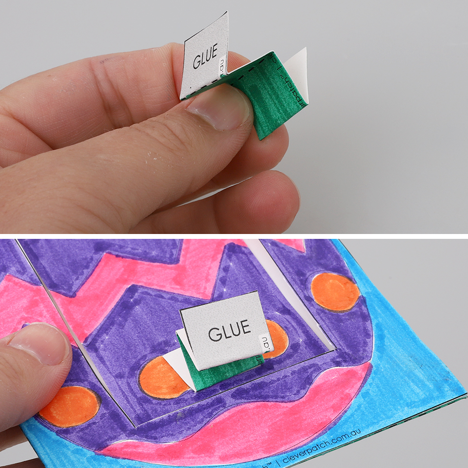 • Step 6Accordion fold the prop along the dashed lines so that the ‘Glue’ box is facing up. Apply glue to the grey section on the slider piece. With the ‘Glue’ box still facing upwards, attach the bottom fold of the prop to the glue on the slider. Allow to dry.