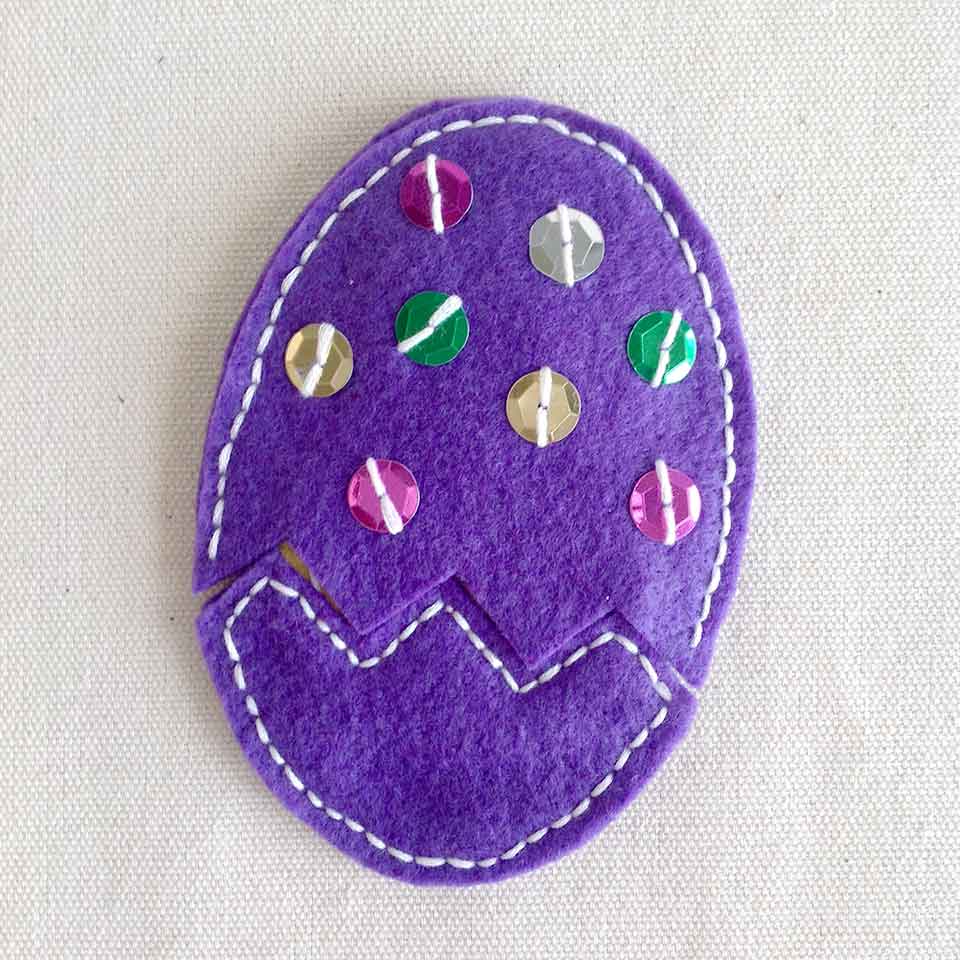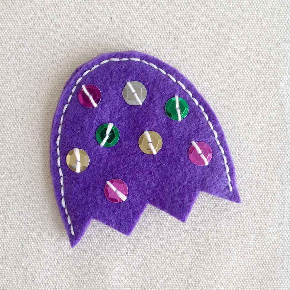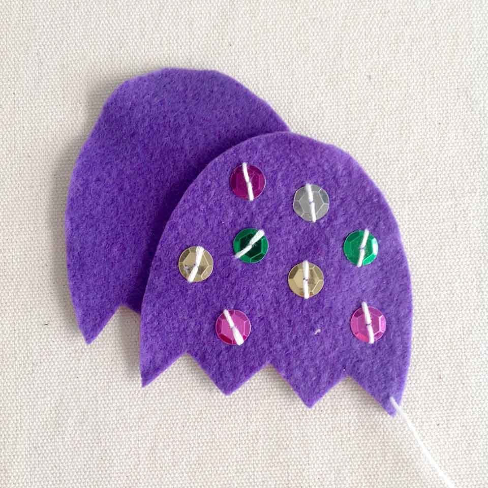 • Step 6Sew some sequins on one of the large egg pieces.