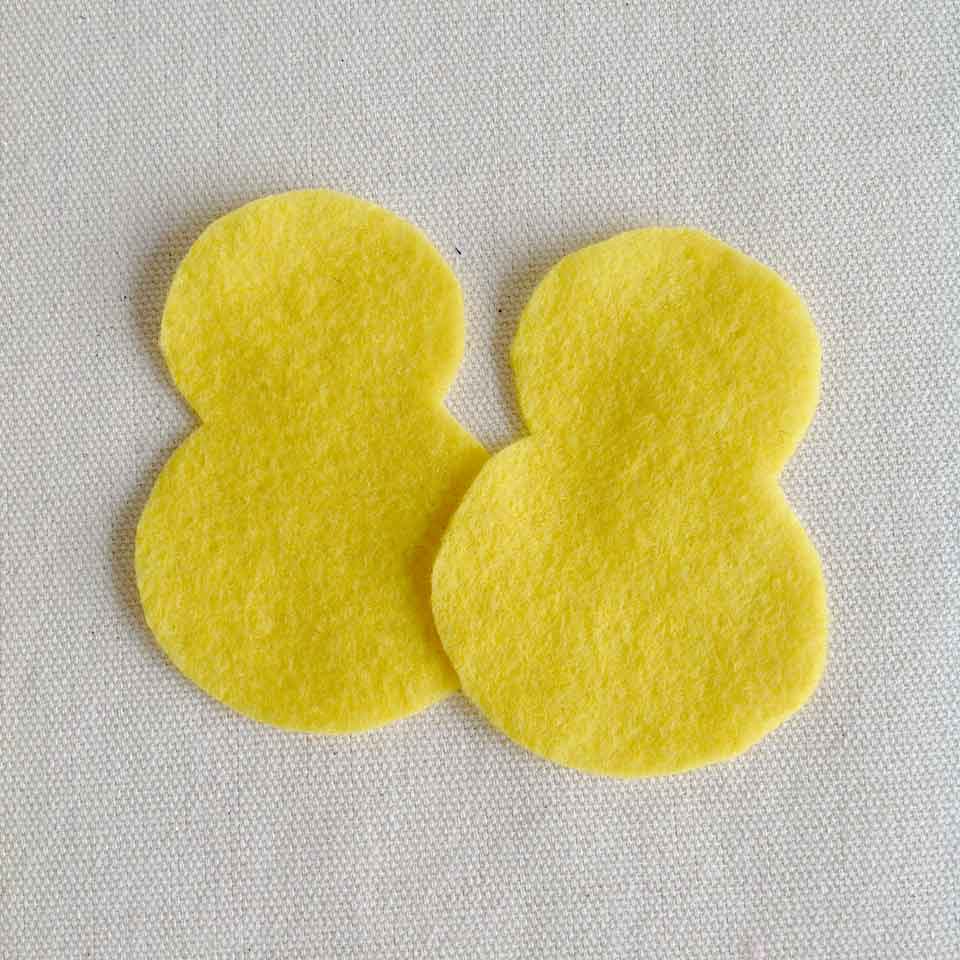 • Step 1Using the template provided, cut out two chick shapes from felt. Adult supervision is recommended when using scissors.