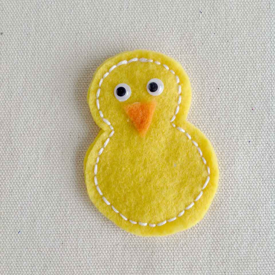 • Step 3Cut out a small triangle shape from orange felt to create a beak. Place two wiggle eyes on your chick's face. Attach the beak and eyes with glue. Allow to dry.