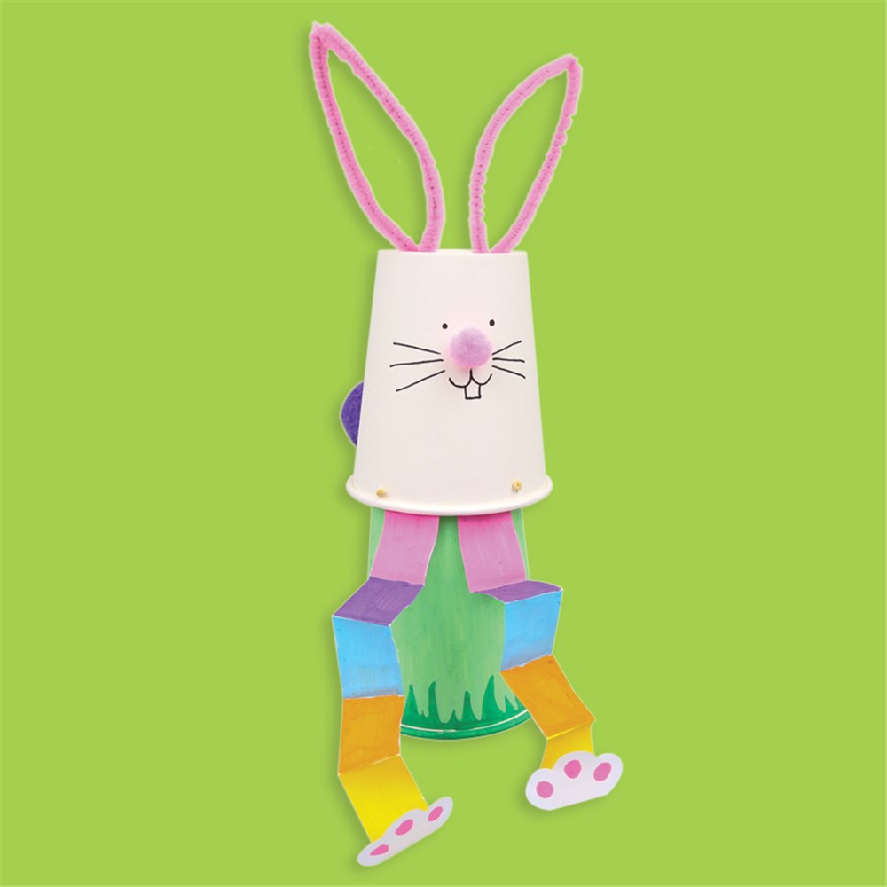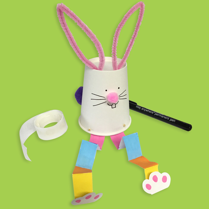 • Step 7 Use glue dots to attach a pom pom nose, tail and the legs from step 1 to the same paper cup that the chenille stem ears are in. Using a permanent maker, draw a face for your bunny. You may also want to concertina fold the legs like we did. Place the Bunny on top of the second paper cup, push down and let go! Watch your Hopping Bunny bounce around!