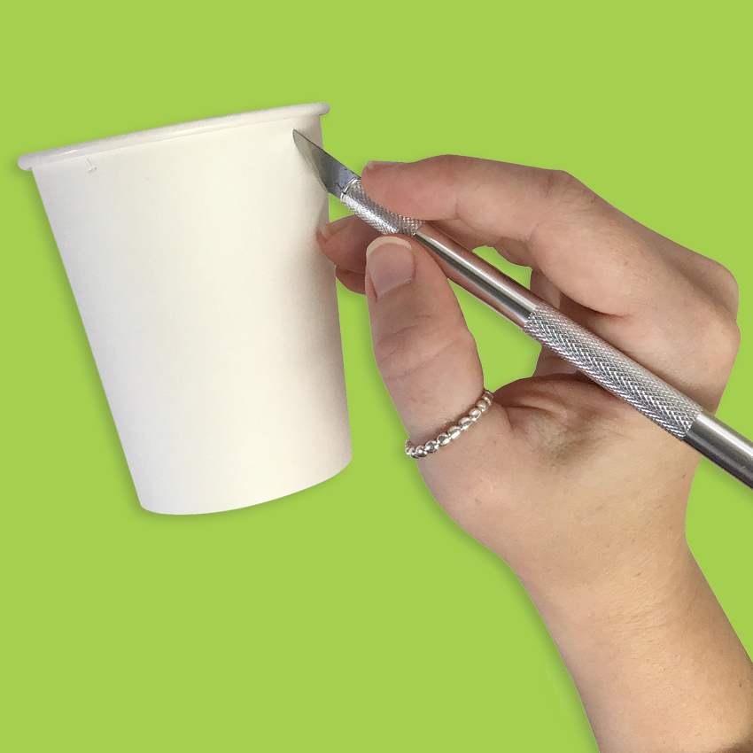 • Step 2 Using a ruler and pencil, create a mark on the top rim of both sides of one of the paper cups. Create another two marks diagonal to the first so the marks form an 'x'. Use the marks you just created as a guide and cut a hole in the sides of the cup 1cm under each mark.