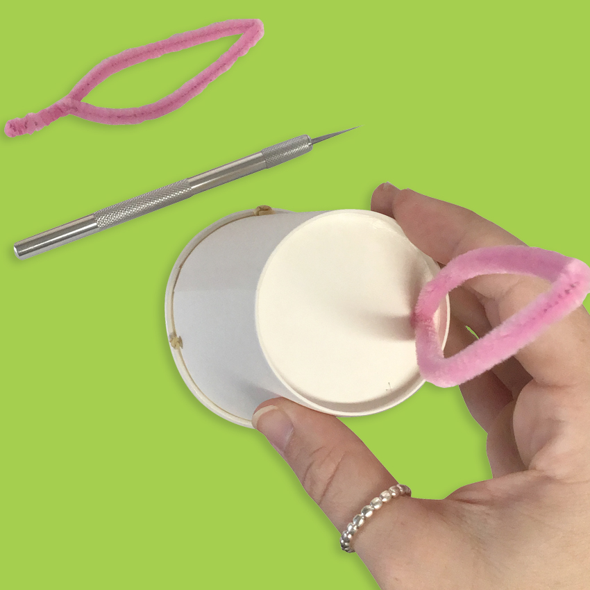 • Step 5 Score a small 'x' into the top of the paper cup on one side, then push the chenille stem ear through the hole. Repeat steps 4 and 5 for the other ear.