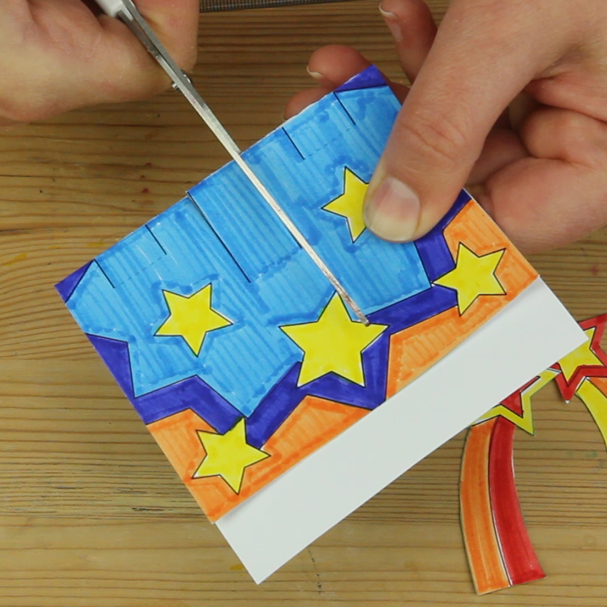 • Step 4Use a glue stick to fix the 3 remaining template pieces in place on the pop-up. The large starburst will need to be attached to the centre tab, while the 2 shooting stars will go either side. Allow to dry.