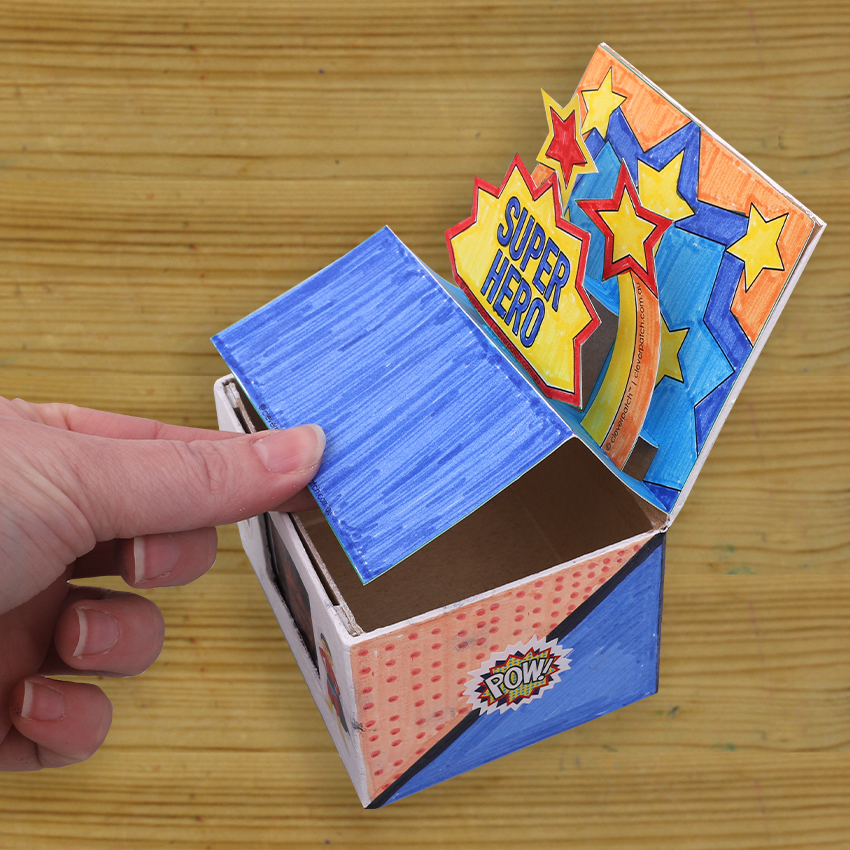 • Step 9Cut some cardboard pieces small enough to fit in your box. Decorate and write down reasons why Dad is your hero on each card and place them in the box. Your Super Hero Pop-Up Box is now ready to give to Dad on Father’s Day!