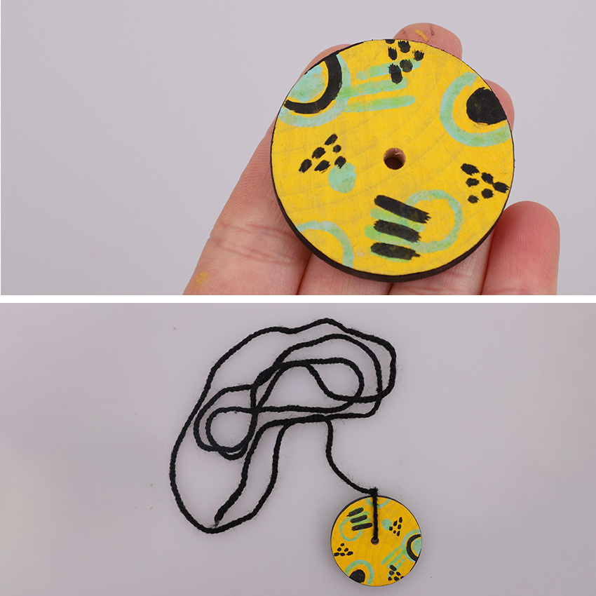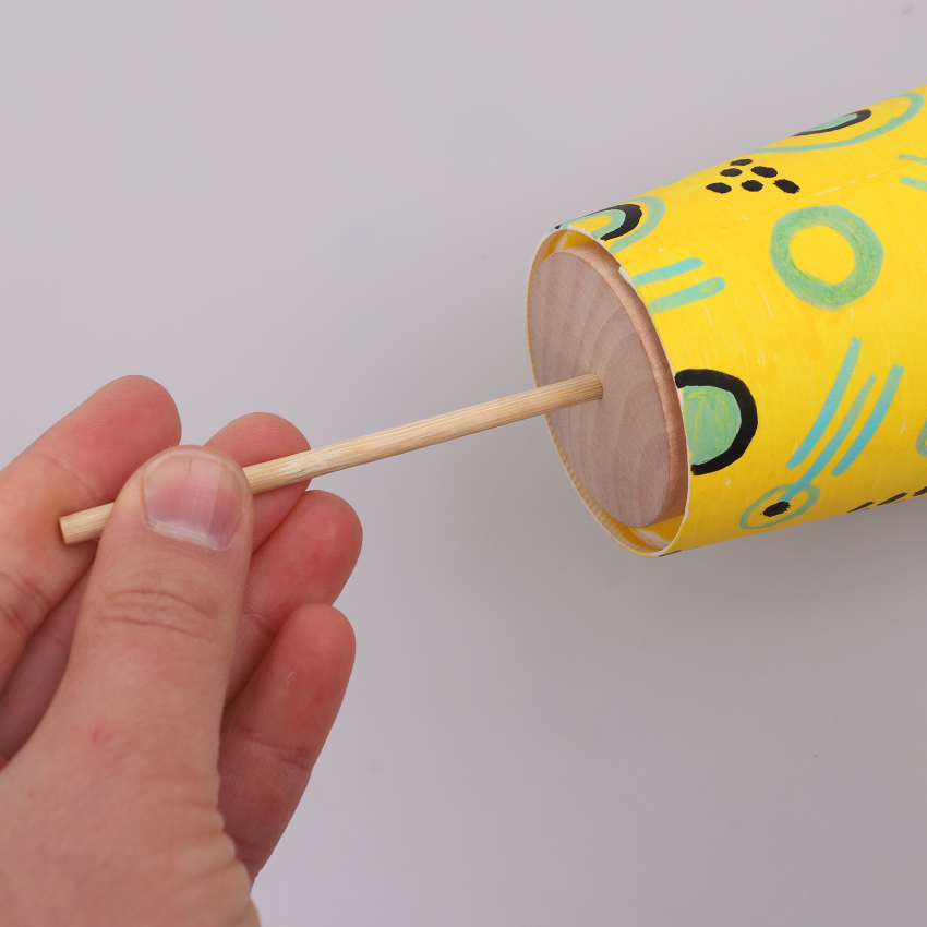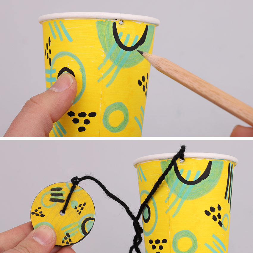 • Step 3Decorate a wheel to match your cup. Allow to dry if needed. Tie a 40cm piece of yarn onto the wheel using a double knot. Trim any excess. Adult supervision is recommended when using scissors.