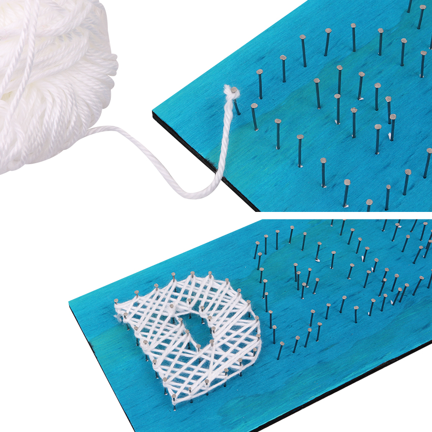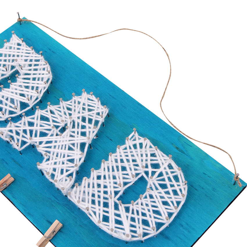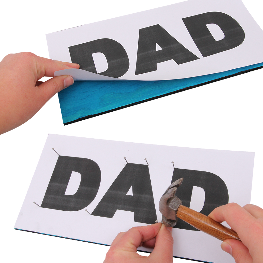 • Step 3Print and cut out the template provided. Lay the template over the string art board and use a hammer to carefully tap in a few nails around the letters so that the template is held in place. Adult supervision is recommended when using scissors and hammers.