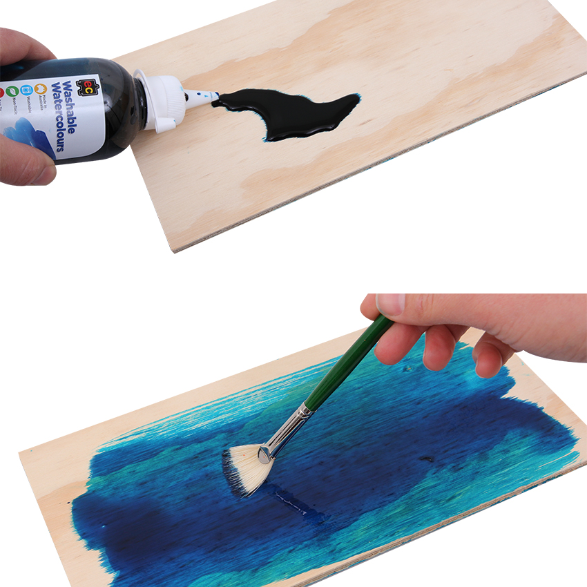 • Step 1First we want to stain the string art board using liquid watercolour. Protect your work area by putting down a splash mat or some scrap paper. Squeeze some of the watercolour directly onto the board and use a fan brush to spread the colour all over the surface. Allow to dry.