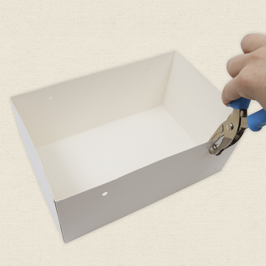 • Step 3 Along the longer sides of the box, measure 5cm inwards and 2cm downwards from the edges. Use a hole punch or scissors to create 2 holes on both sides, making sure they are aligned.
