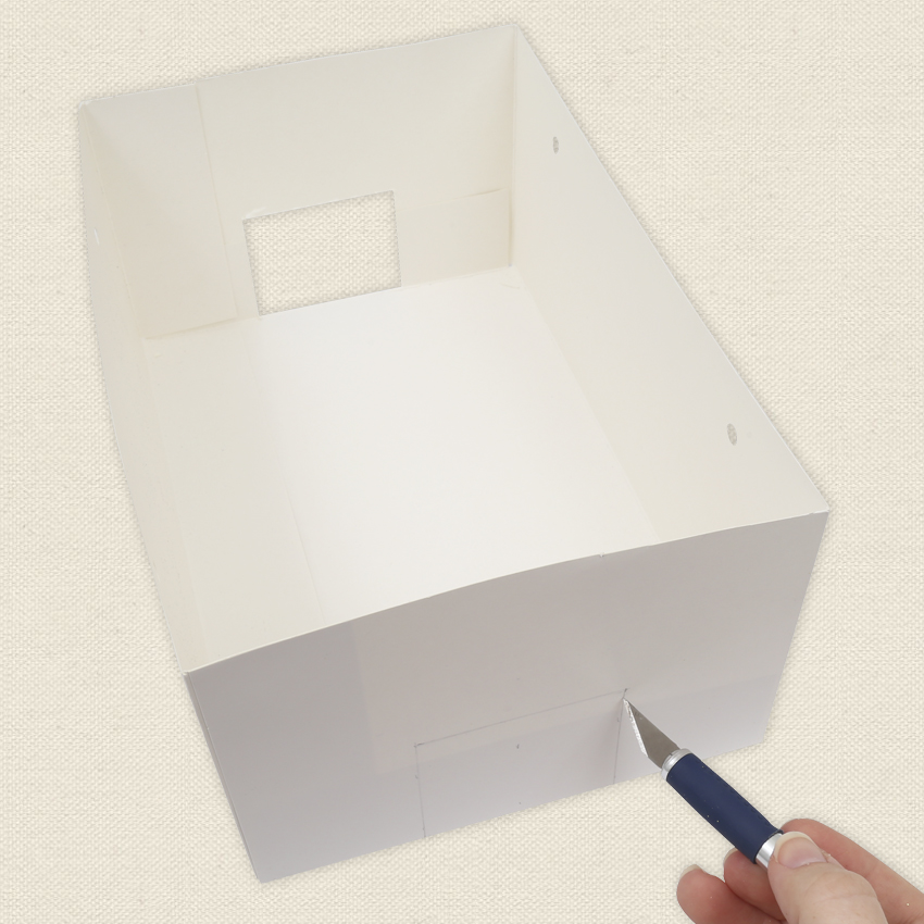 • Step 4 Measure a rectangle 5cm x 6cm in the bottom/centre of the diorama box on both of the shorter sides. Use a hobby knife to cut out the rectangles you have drawn on each side. Adult supervision is recommended when using a hobby knife.