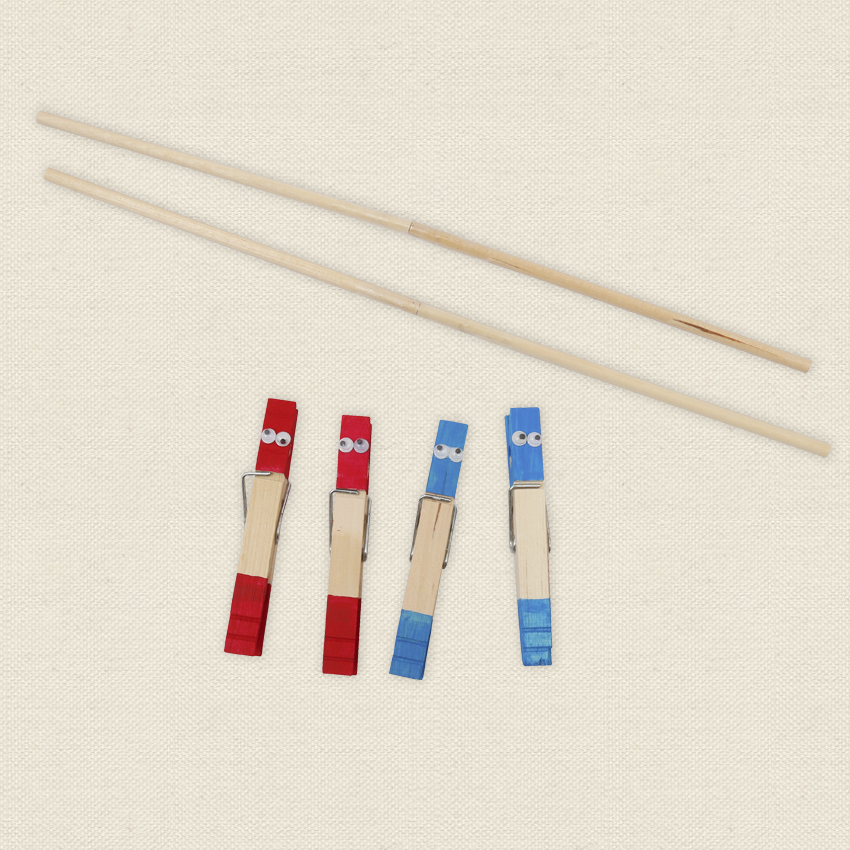 • Step 6 Tape 2 wooden dowels together. Repeat so you have another 2 dowels taped together. Decorate 4 wooden pegs using CleverPatchâ„¢ Acrylic Paint and wiggle eyes. The pegs will be your team players! Allow to dry.