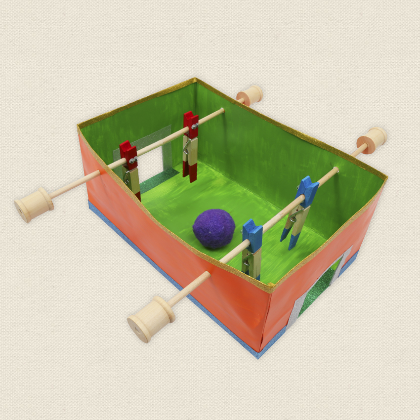 • Step 8 Place wooden spools on the end of each dowel to use as handles. Place a large pom pom in the centre and your game of foosball is ready to play!
