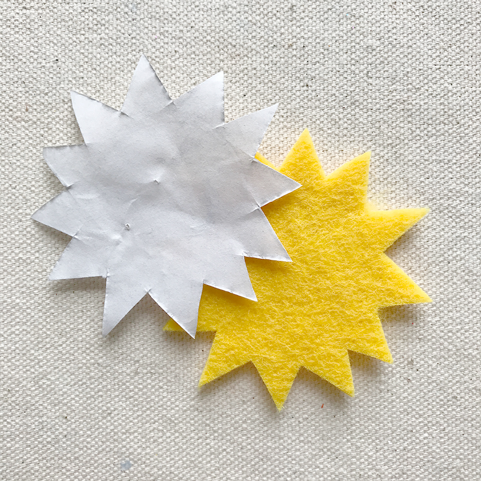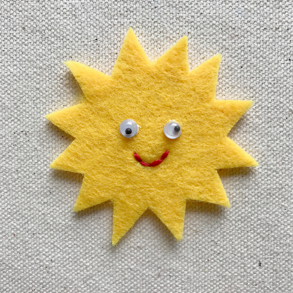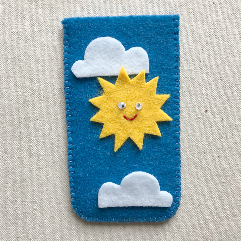 • Step 3 If you plan on decorating the felt pieces further, be sure to do so before securing them to the main phone cosy. In our example, we added a face to the sun by glueing on wiggle eyes and stitching in a smile. Allow to dry if needed.