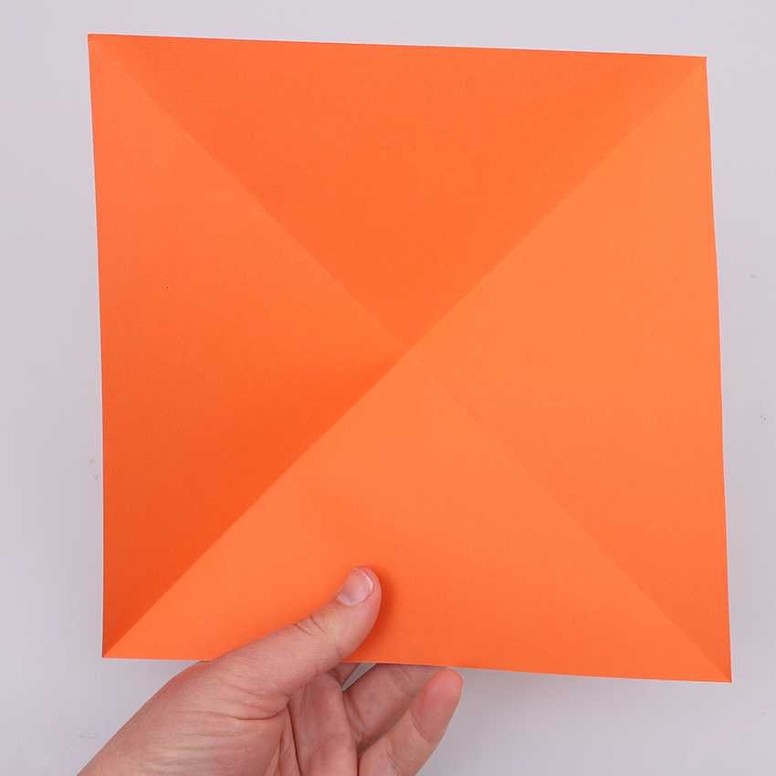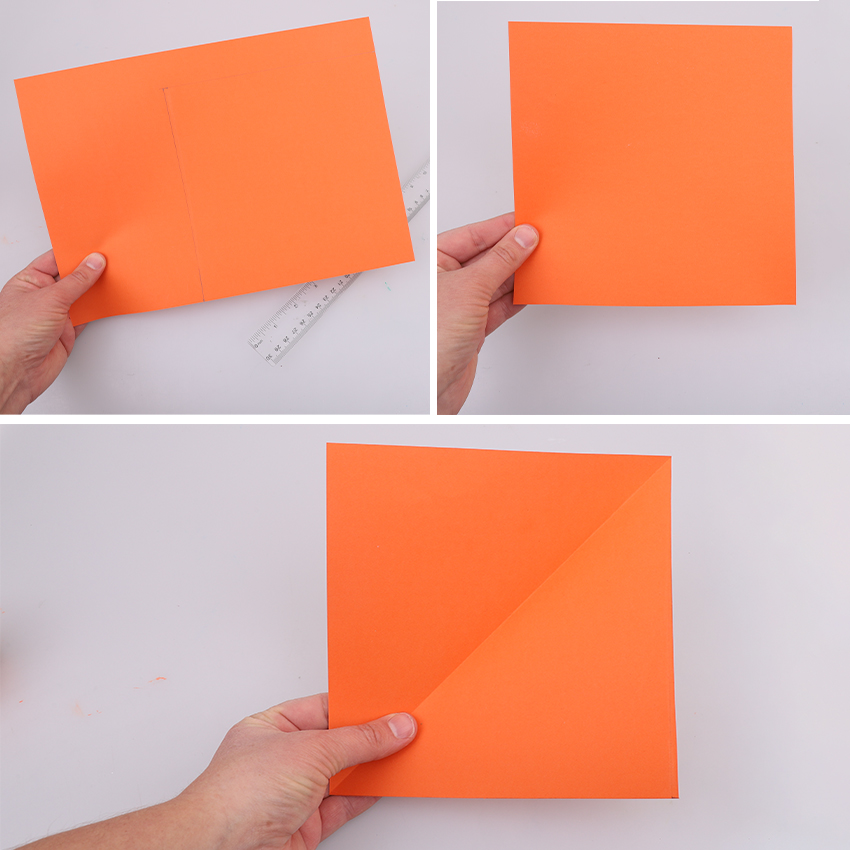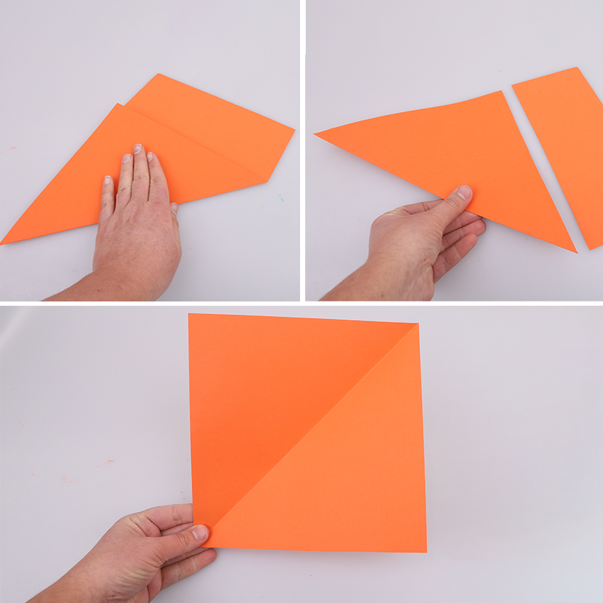 • Step 1Cut a square from an orange sheet of cover paper. To do this easily, fold one of the corners on a diagonal then trim the excess paper as shown. Adult supervision is recommended when using scissors. Unfold your square.