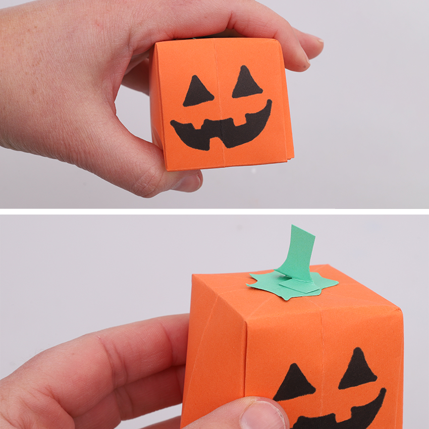 • Step 13Use a permanent marker to draw a jack-o’-lantern face on one side of the large box, making sure the base of the box is facing upwards. Use green cover paper to create a top and stalk of the pumpkin and glue in place. Allow to dry.