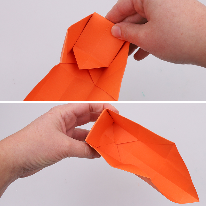 • Step 9Fold the pointy flap down and over the folded in sections to hold them in place.