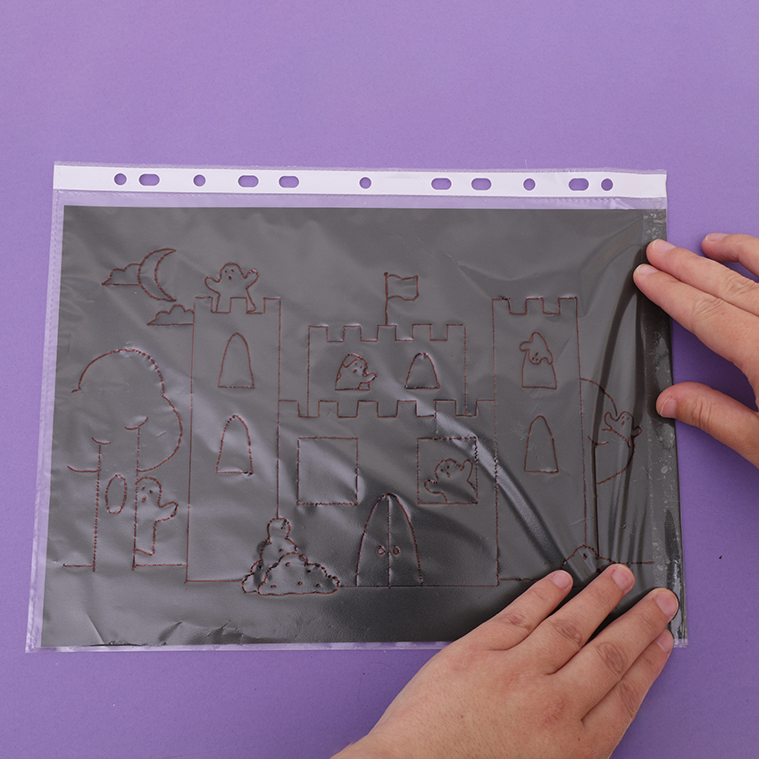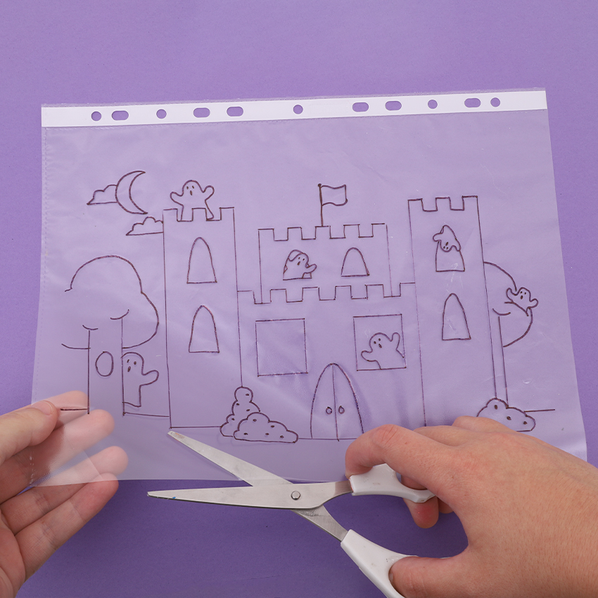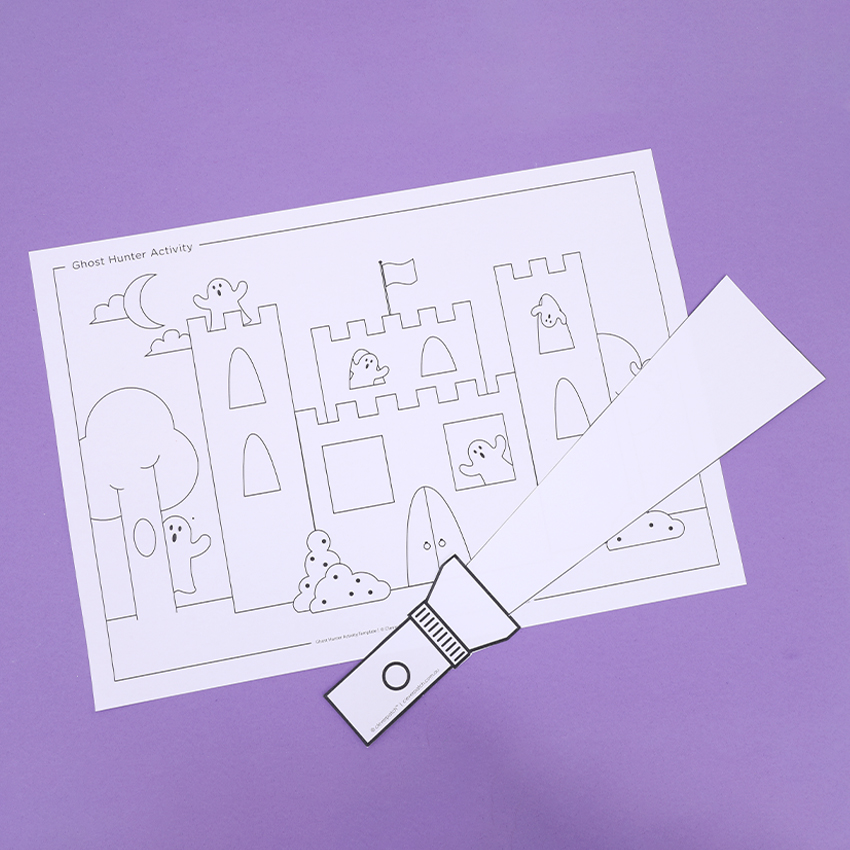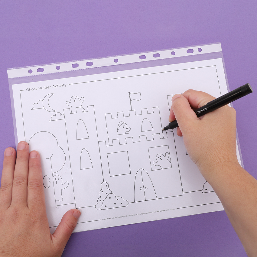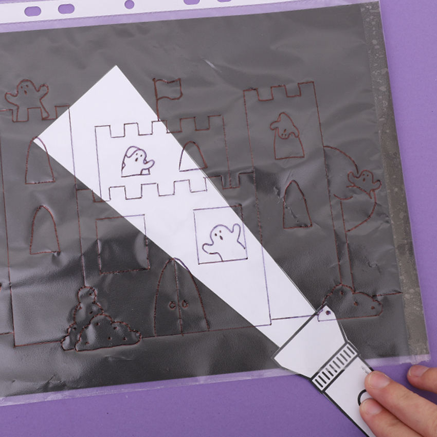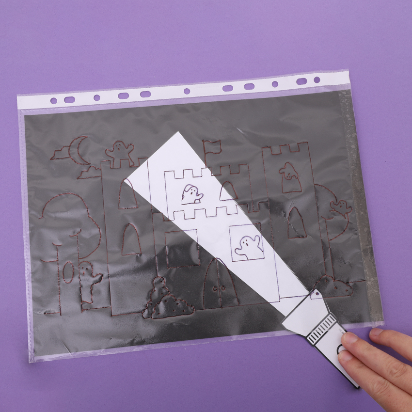 Use your torch to spot the ghosts – how many can you find? This activity is also a great way to reuse an old plastic sleeve!