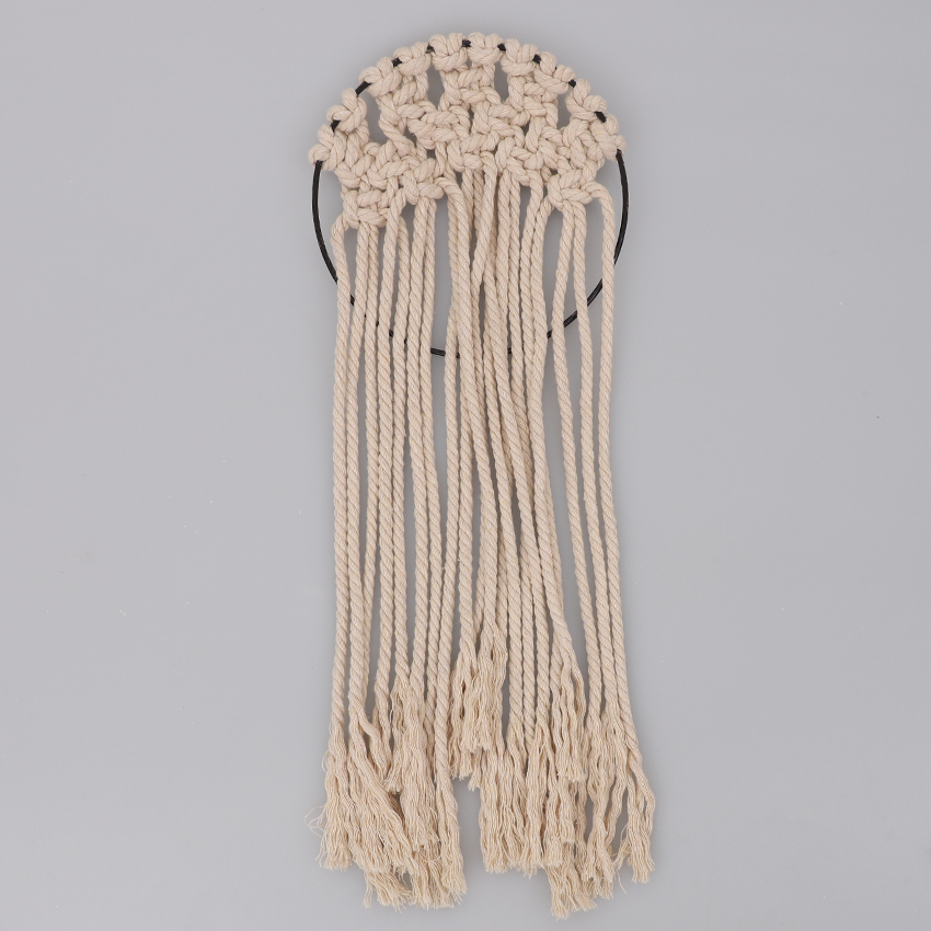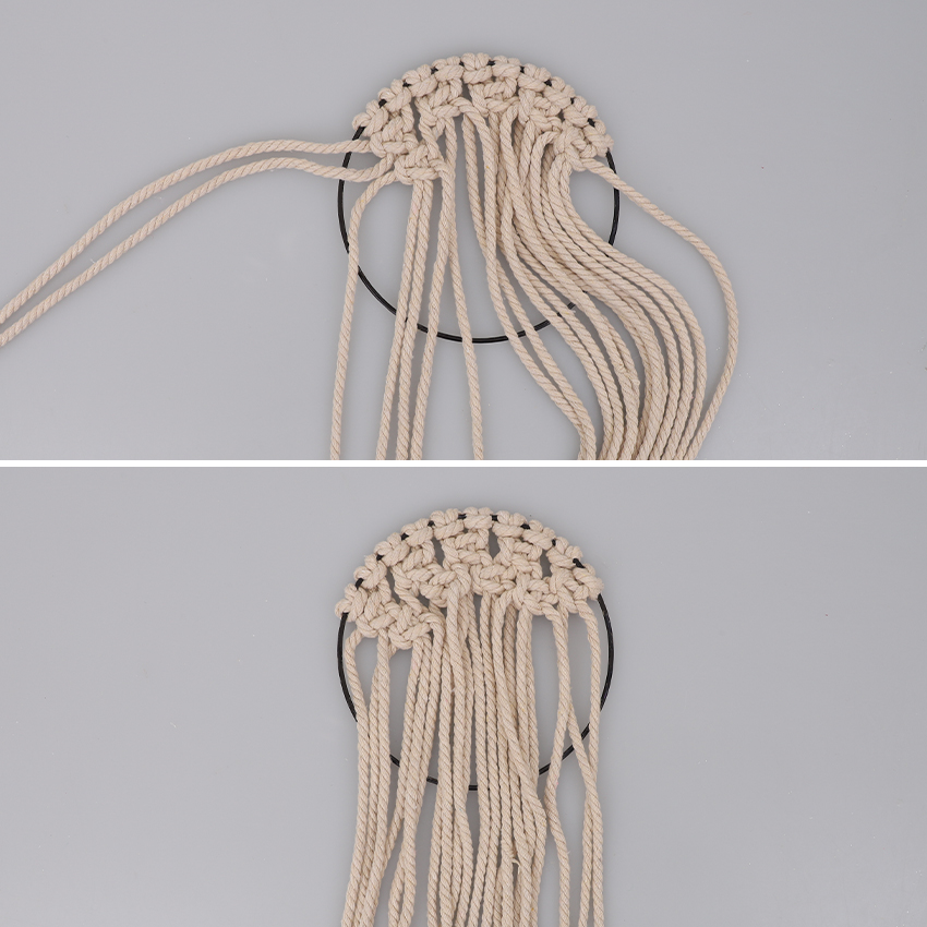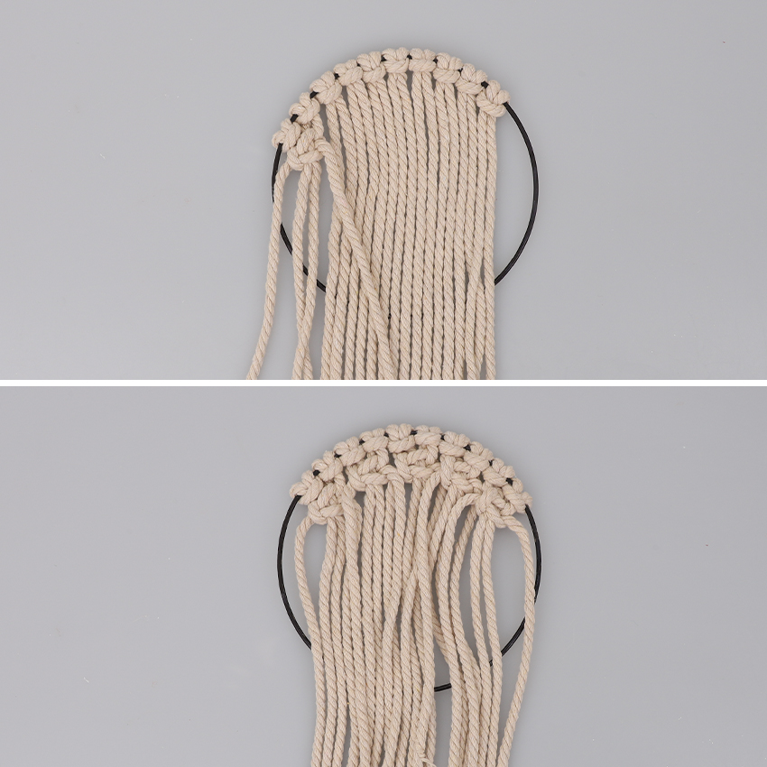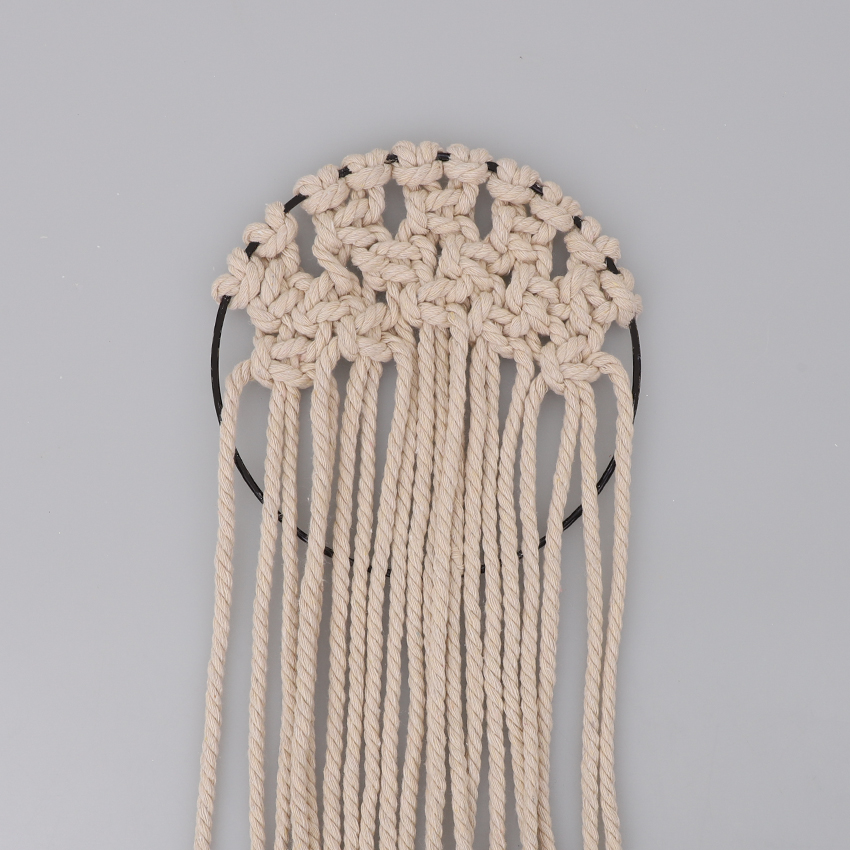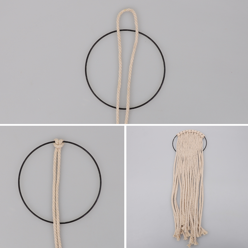 • Step 3Cut ten 1m lengths of macramé cord. Adult supervision is recommended when using scissors. Attach each length to your metal hoop using a cow hitch knot. Adjust the lengths so they are along the top of the hoop as shown.