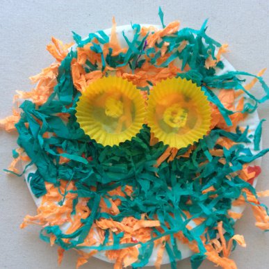• Step 4Glue wiggle eyes into some small patty pans, then glue the small patty pans into the large patty pans. Allow to dry.