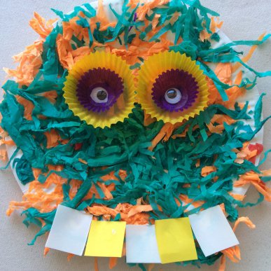 • Step 5Using coloured paper, cut out squares for the monsters teeth. Glue these onto the face.