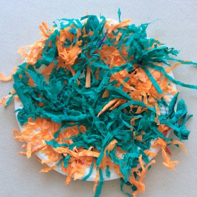 • Step 1Cover the front of your paper plate with glue and apply the shredded paper. Allow to dry.