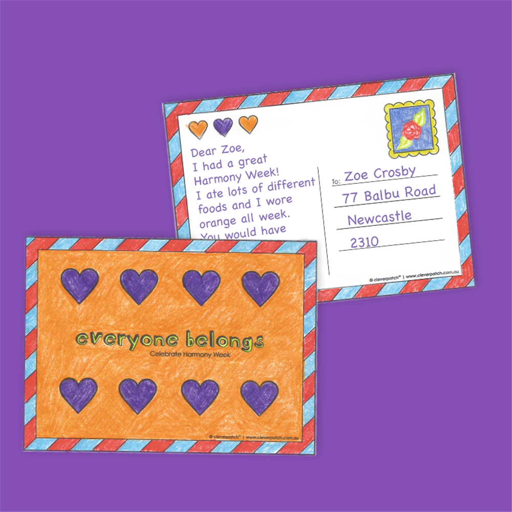 Everyone belongs! Create a sense of inclusion by writing about your Harmony Week celebrations on our FREE Harmony Week Postcard. Send it off to a friend or relative, letting them know what you have been up to!