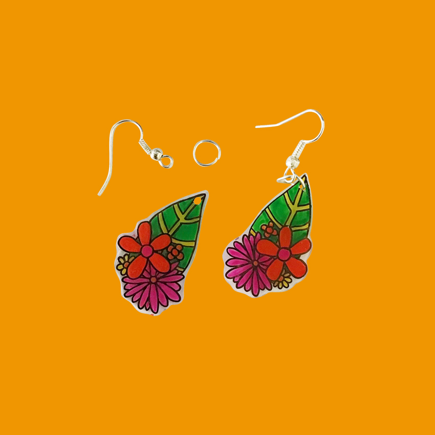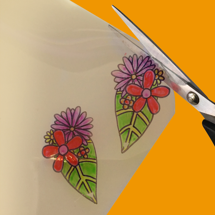 • Step 4Place both earrings onto baking paper, with another piece on top to stop them from curling. Follow the instructions provided within the Shrink-Me Plastic pack to shrink the earrings.