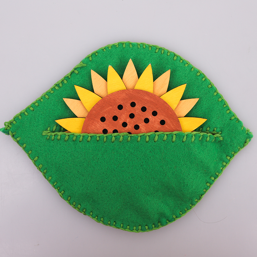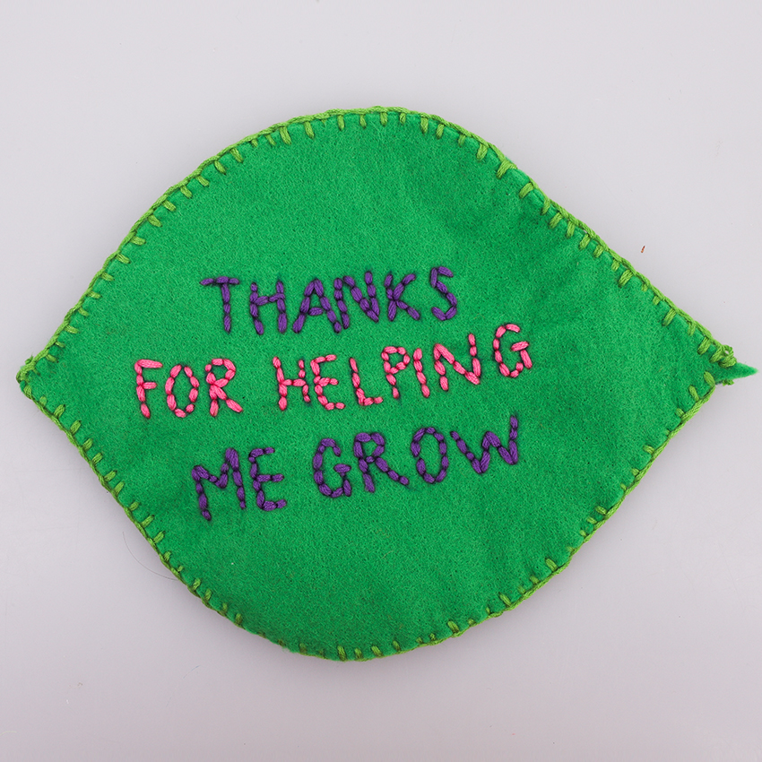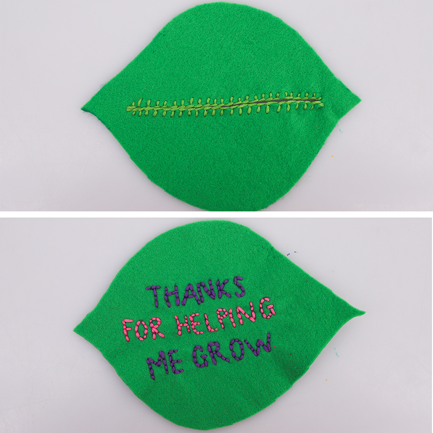 • Step 3Use blanket stitches to sew around the edges of the slit that you cut in step 2. Adult supervision is recommended when using sewing needles. You can learn how to sew a blanket stitch here. On the other felt leaf, sketch out a message such as ‘Thanks for helping me grow’ using a HB pencil. Sew over your message using back stitches. You can learn how to sew a back stitch here.