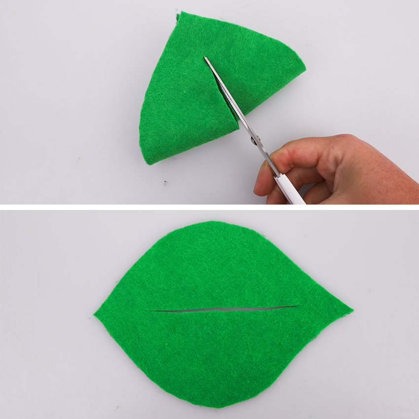 • Step 2Take one of the leaves and fold it in half (pointy end to pointy end). Use scissors to cut a 6.5cm line straight down the middle from the fold line as shown. When you unfold, there will be a slit in the middle of the leaf.