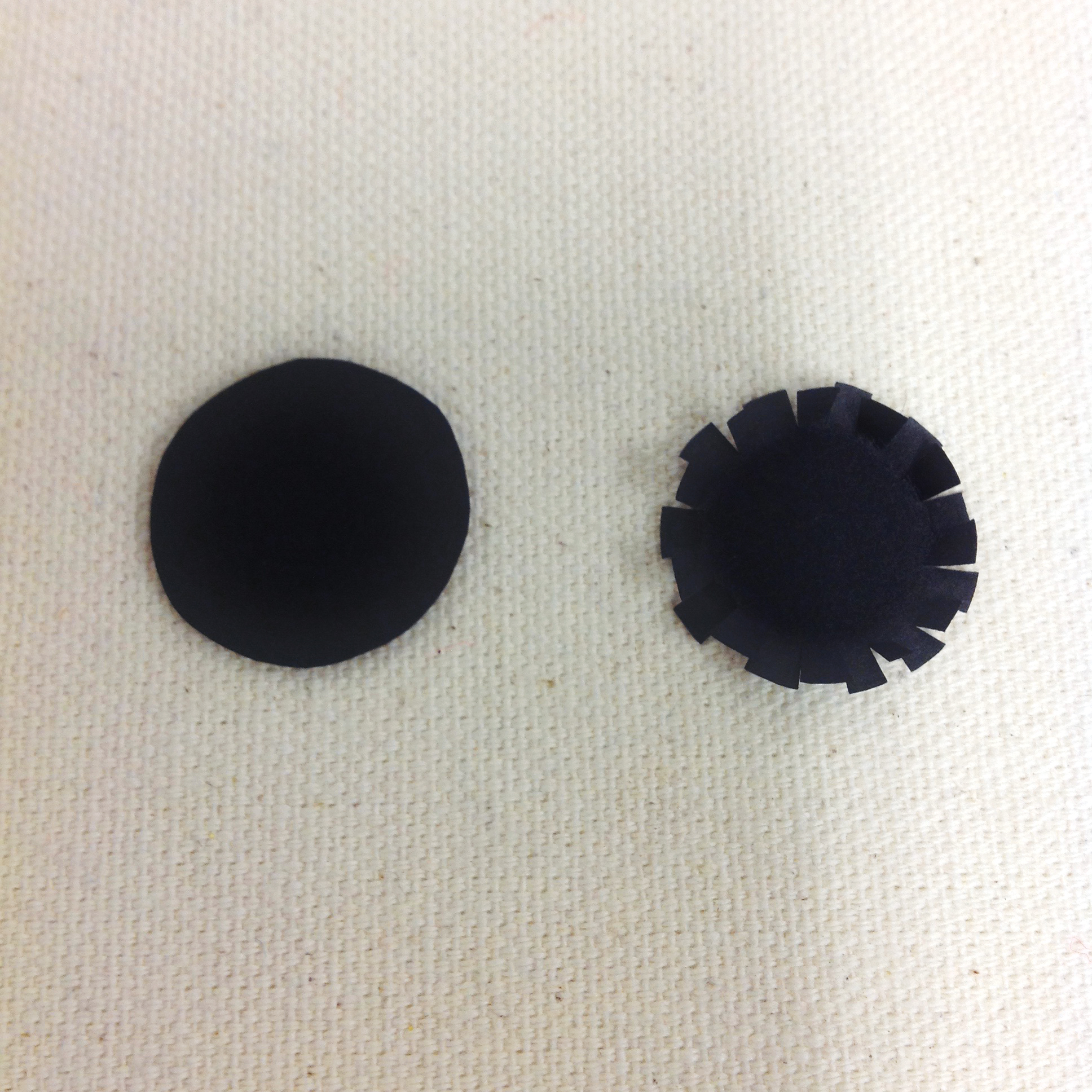 • Step 4 Cut out two circles with a diameter of 1.5cm from black cover paper. Cut small slits around the edges of both circles. Fold every second slit inwards.