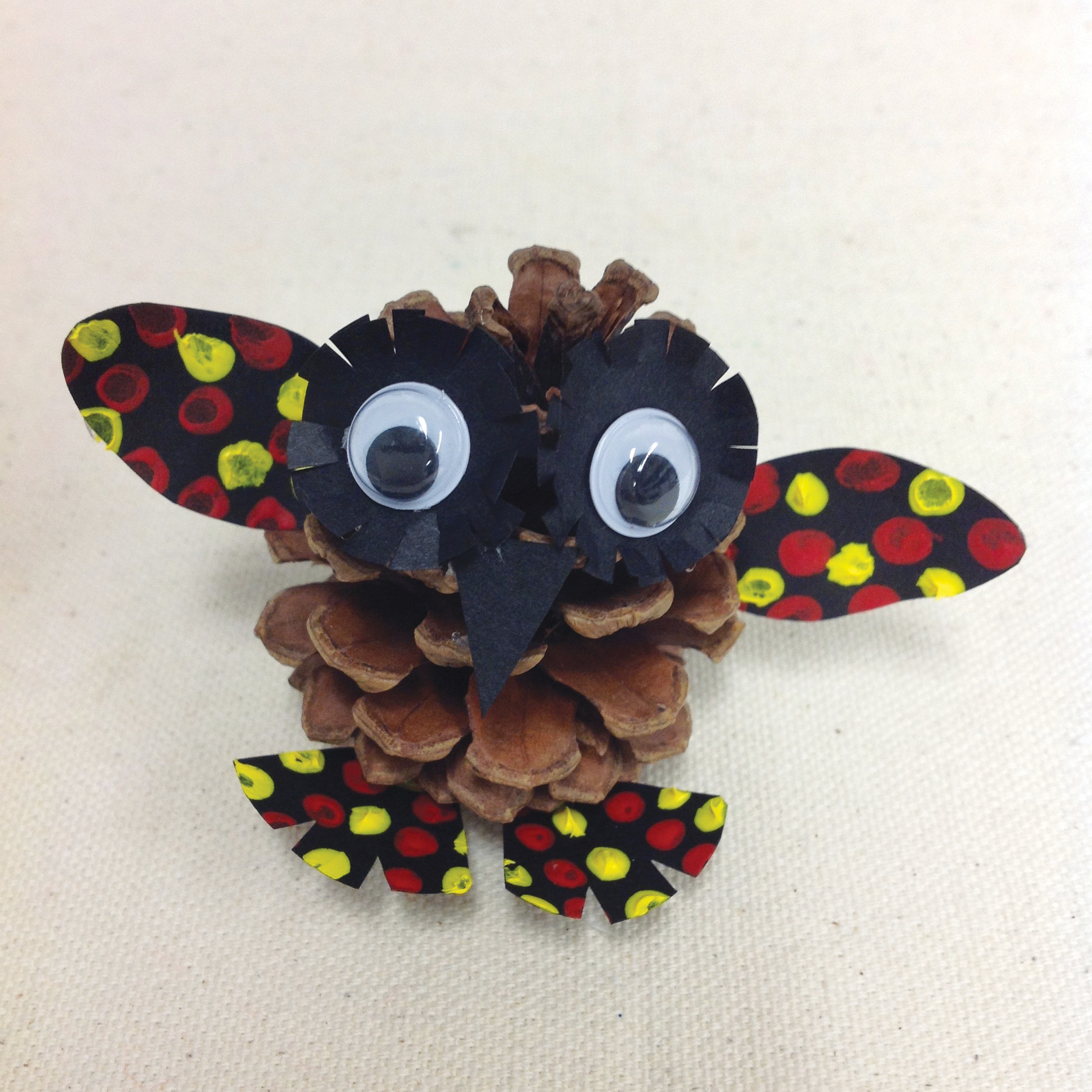 • Step 3 Use a hot glue gun to attach the wings and feet to a pine cone. The pine cone will act as the Owl's body. Allow to dry.
