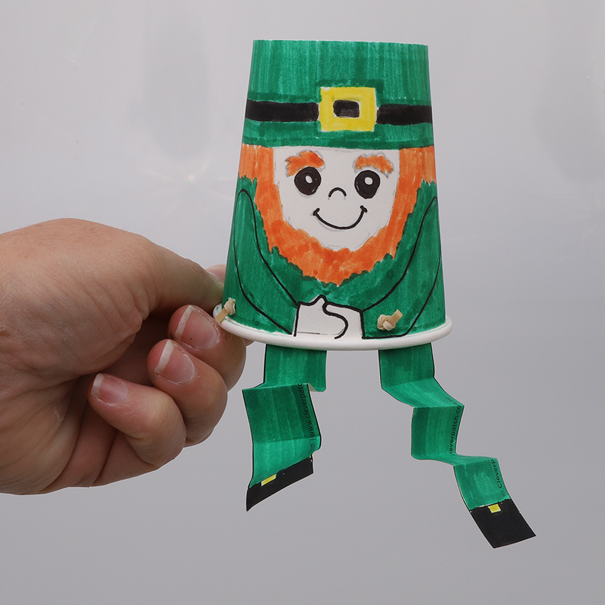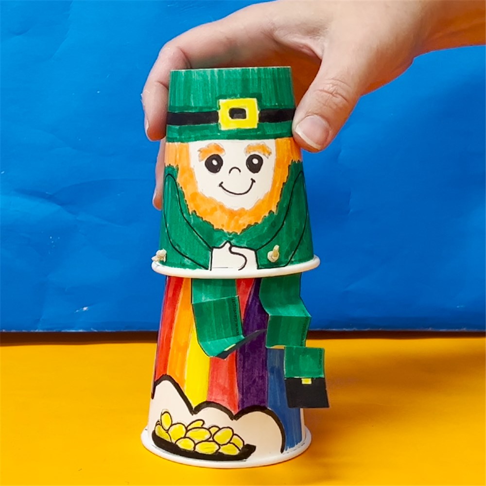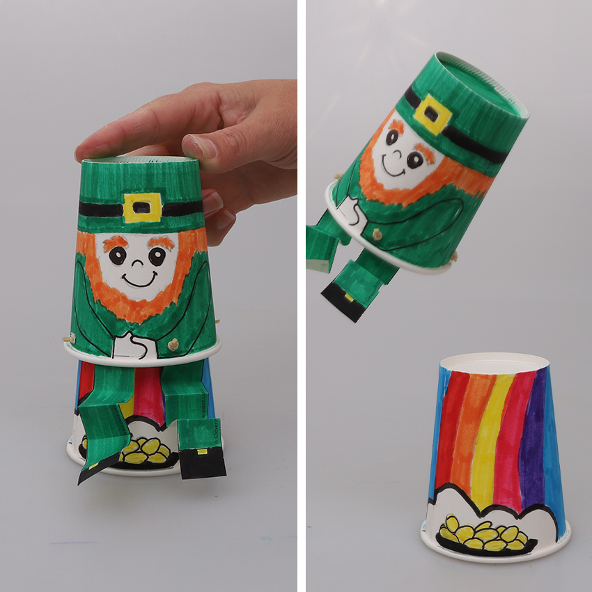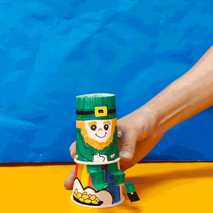 • Step 6Place the leprechaun on top of the rainbow cup ready to leap. Push the leprechaun down and then release to watch your leprechaun leap into the sky!