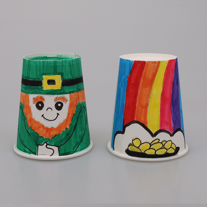 • Step 2Take 2 paper cups and decorate one as a leprechaun and the other as a pot of gold with a rainbow. You can use our image as a guide.