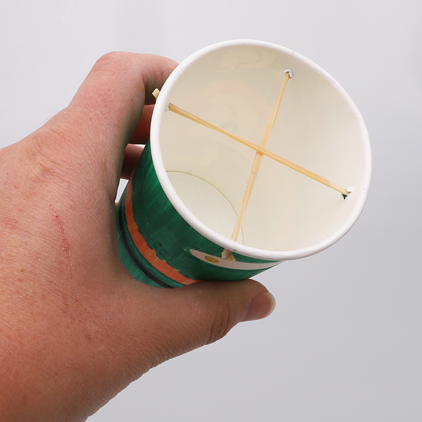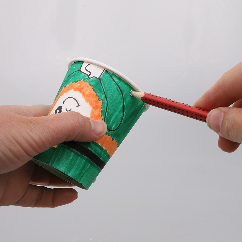 • Step 3Use a sharp pencil to carefully poke 4 holes around the edge of the leprechaun cup opening. Place one at the front of the cup, then directly opposite at the back and the other 2 on either side of the cup.