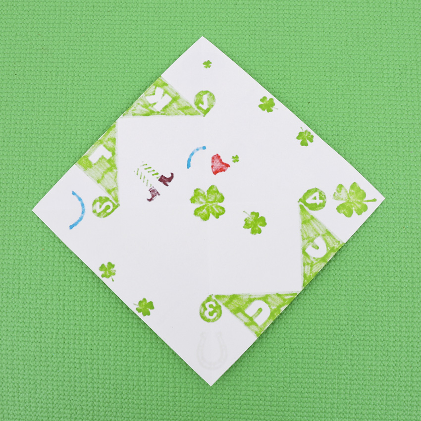 • Step 3Start with your design facing down. Fold the square in half corner to corner, making a triangle, then open it back out and repeat with the opposite corners.