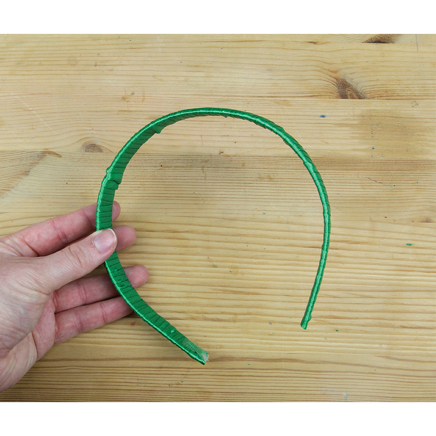 • Step 1Wrap the ribbon around the head band, making sure you overlap as you go to completely cover the plastic. Cut and secure the ribbon ends with tape or glue. Adult supervision is recommended when using scissors. Allow to dry if needed.
