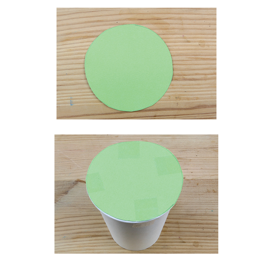 • Step 3On the same piece of cardboard, trace around the top of a paper cup again. Cut out the circle and attach it to the rim of the cup with tape.
