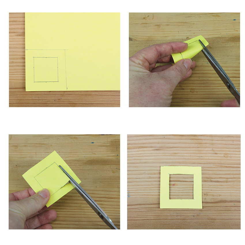 • Step 6Measure a 5 x 5cm square on yellow cover paper. Inside the square, measure a small 3 x 3cm square 1cm in from the outside square. Cut out the large square, then cut the middle square out to create a square frame that will be your buckle.