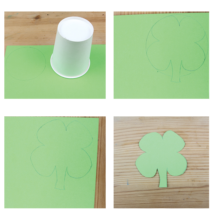 • Step 2On a sheet of green cardboard, trace around the top of a paper cup. Use the circle as a guide and draw a four-leaf clover within the circle, then add a stem to the bottom. Erase the circle lines leaving the outline of the clover and cut out.