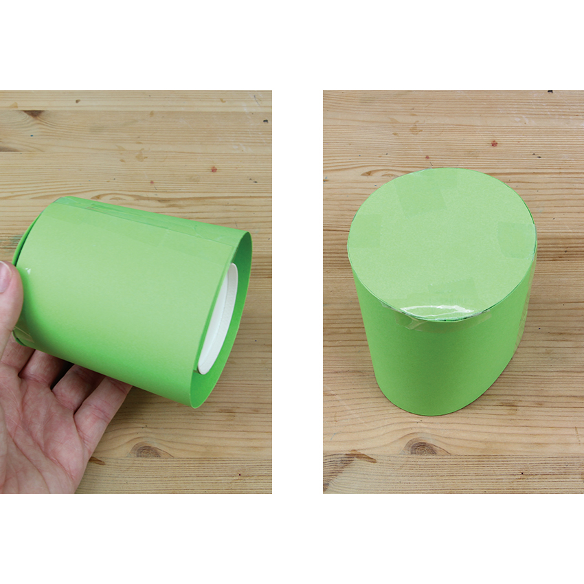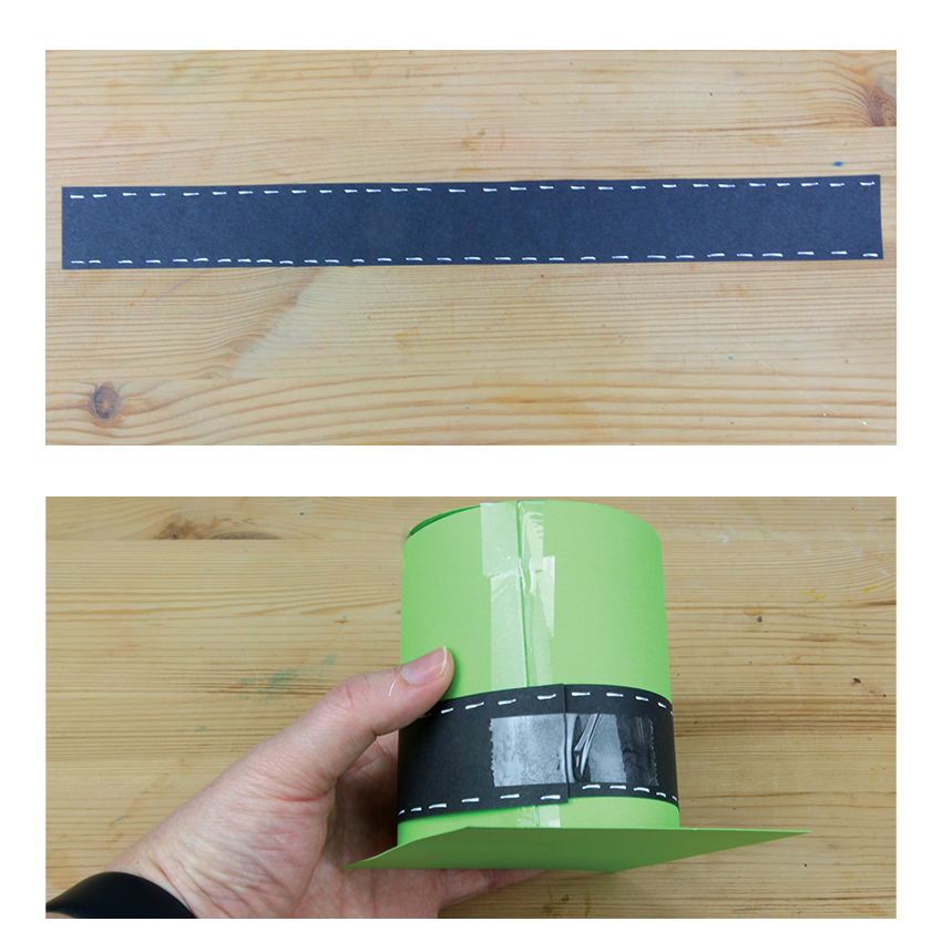 • Step 7Measure and cut a 3cm wide strip of black cover paper. Use a white POSCA marker to add hem details to the black strip. Wrap around the bottom of your green cardboard hat and tape at the back to secure.