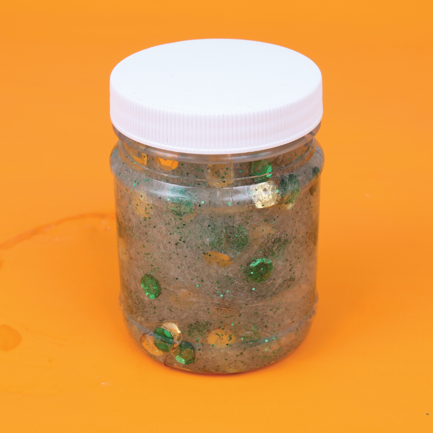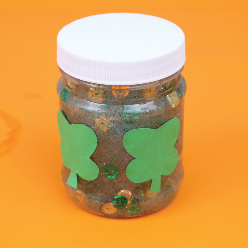 • Step 7Decorate your jar by cutting shamrocks from cover paper and sticking them to the outside of the jar using double sided tape. Adult supervision is recommended when using scissors. Your slime is now ready for St Patrick’s Day!