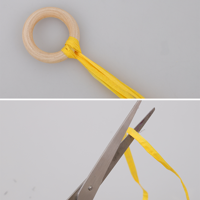 • Step 2Take one of the 2m lengths and fold it in half and then in half again. Take the end with a double loop and attach it to a wooden ring using a cow hitch knot. Once attached, you will notice that one of the loose ends will still be looped. Cut this with scissors so all the ends are loose.