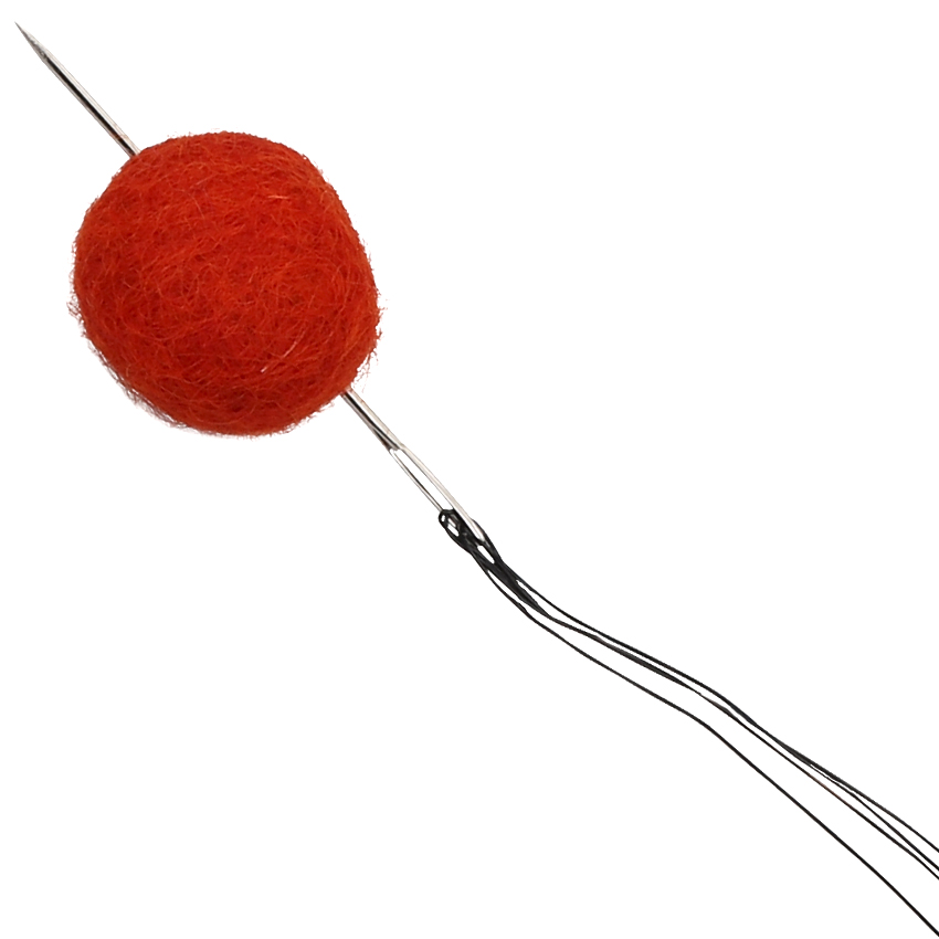 • Step 1Cut a 68cm piece of beading wire – we have chosen to use black. Adult supervision is recommended when using scissors. Fold the wire in half, then thread it though the eye of a sewing needle. Thread the needle through the centre of a felt ball (we have chosen a red one). Stop pulling the wire through the ball once it reaches half of its length. You should have four pieces of wire sticking out of each side of the ball. Leave the needle as is at this stage.